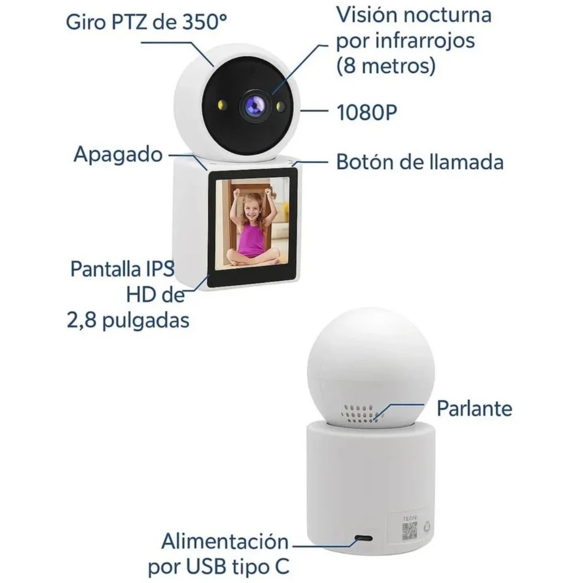 - Audio Bidireccional: Permite la comunicación en ambos sentidos. Habla a la otra persona desde otra habitación para calmarlo o tranquilizarlo con el sonido de tu voz.